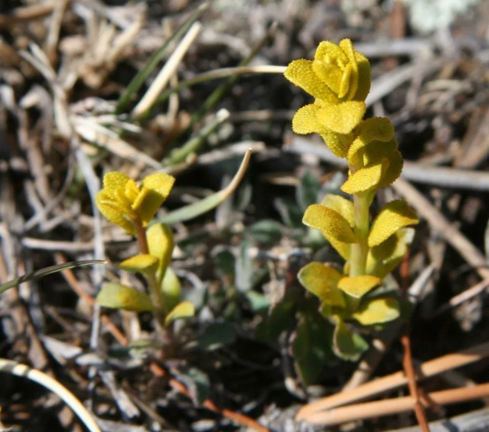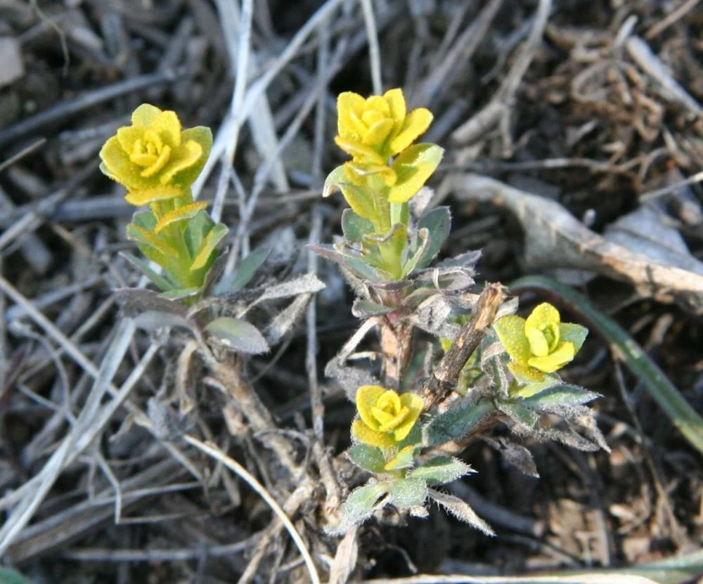 We have found this pretty little impostor in the foothills in March and near timberline in June. It grows only a few inches tall, so look carefully for a small golden spike topped with a "flower” that looks more like a tiny buttercup than a mustard.