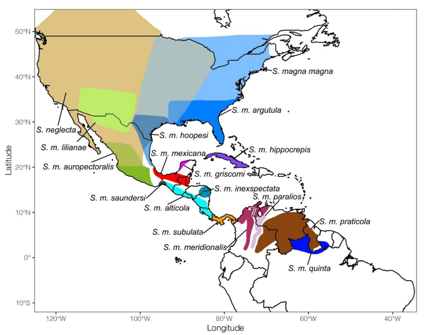 Sturnella range map showing the ranges for Western Meadowlark (S. neglecta) and the subspecies of Eastern Meadowlark (S. magna). The subspecies S. m. lilianae and S. m. auropectoralis are now recognized as the Chihuahuan Meadowlark. Image from Beam, J. K., Funk E. R., Taylor, S. A. (2021). Genomic and acoustic differences separate Lilian’s Meadowlark (Sturnella magna lilianae) from Eastern (S. magna) and Western (S. neglecta) meadowlarks. Ornithology 138:1-13.