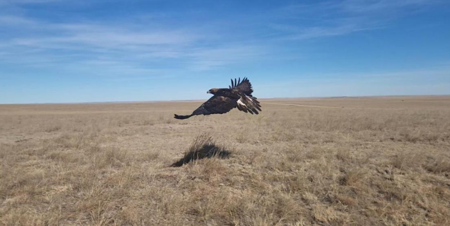 A Golden Eagle being released earlier this month at Pawnee Grasslands after receiving months of treatment at RMRP. Photo courtesy of Rocky Mountain Raptor Program.